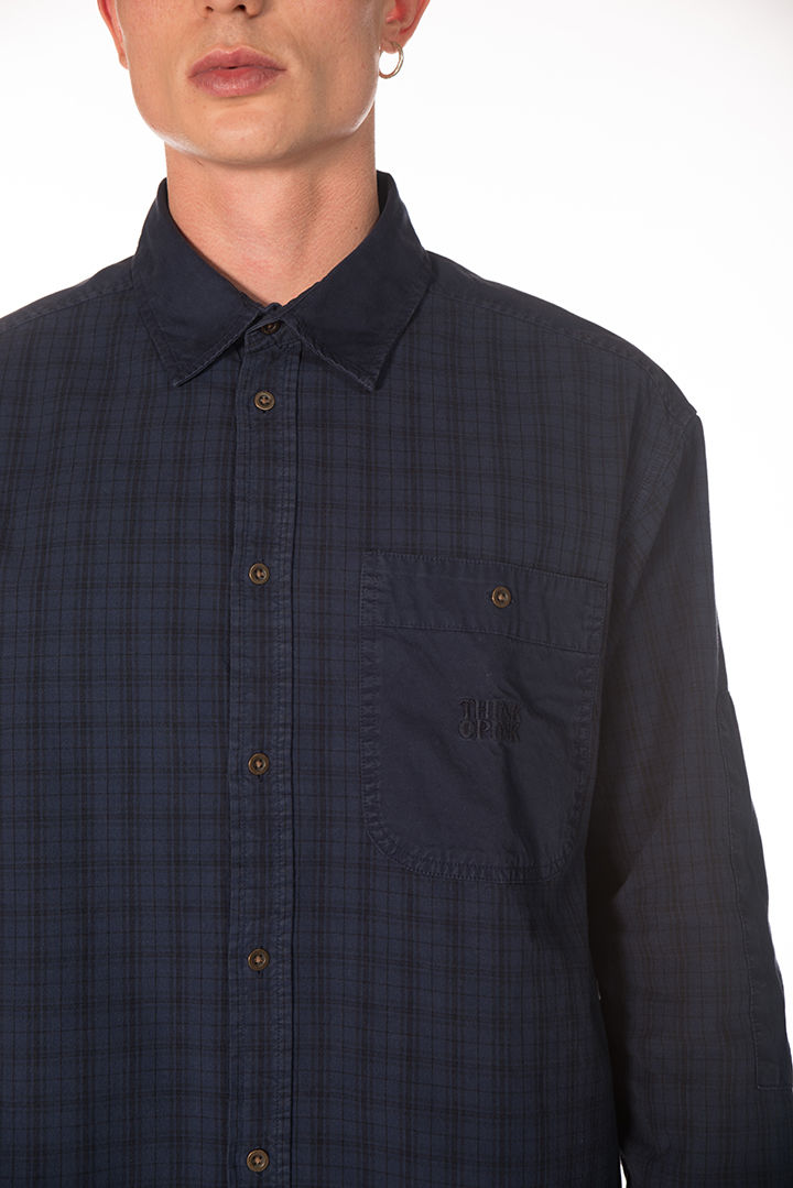 Camicia unisex a quadri, toppe in tinta unita su spalle, gomiti e taschino sul petto con ricamo